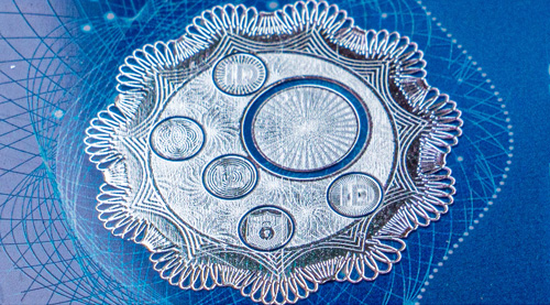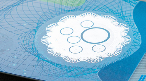 A pseudo-hologram is created by embossing different shapes and colours on top of each other to create an exclusive look. The image content, shape and foil colour can be freely designed and thus offer a high-quality finishing element at low production costs.