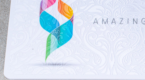 Spot and relief coats are partial high-gloss lacquers. The varnished areas are clearly visible and, in the case of relief varnish, can even be felt due to the very high coating thickness. As the varnish is completely transparent, printed layout elements can be particularly emphasized, provided the line thickness is not less than 1.5 mm. The high-gloss effect is particularly striking on matte laminated cards. Matte varnish on glossy cards is also available.