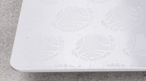 The watermark is a feature on the surface of the card. Like blind embossing, it is only visible when the card surface reflects the light. The form of the watermark can be chosen freely and is printed on the finished personalized cards.